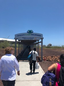 And there were more surprises to come–the plane took off on time…and was back on the ground in 45 minutes, way too soon! And as we were landing I was noticing that we were not on an island and we were in the middle of a pretty good-sized city! Now I know the Galapagos is now a bustling tourist attraction, but I had read lots about the airport on Baltra and this clearly was notit! Had we been hijacked? Did we all get on the wrong plane? As we taxied along I could see we were at the airport of Guayaquil, a city south of Quito, on the mainland–we had not been told, but this was a one stop flight! We waited 45 minutes for one group of people to get off the plane and another group to get on, and then we resumed our trip to Baltra! Just prior to landing we experienced something unique to us–to protect the wildlife from invasive pests hitchhiking in on luggage, the flight attendants opened up all of the luggage compartments and sprayed them all with pesticides! Pat noted dryly that they didn’t bother with the backpacks and such stowed under the seats. Similarly, we were not permitted to retrieve or luggage until a security dog had sniffed every piece! But finally, we did arrive!
